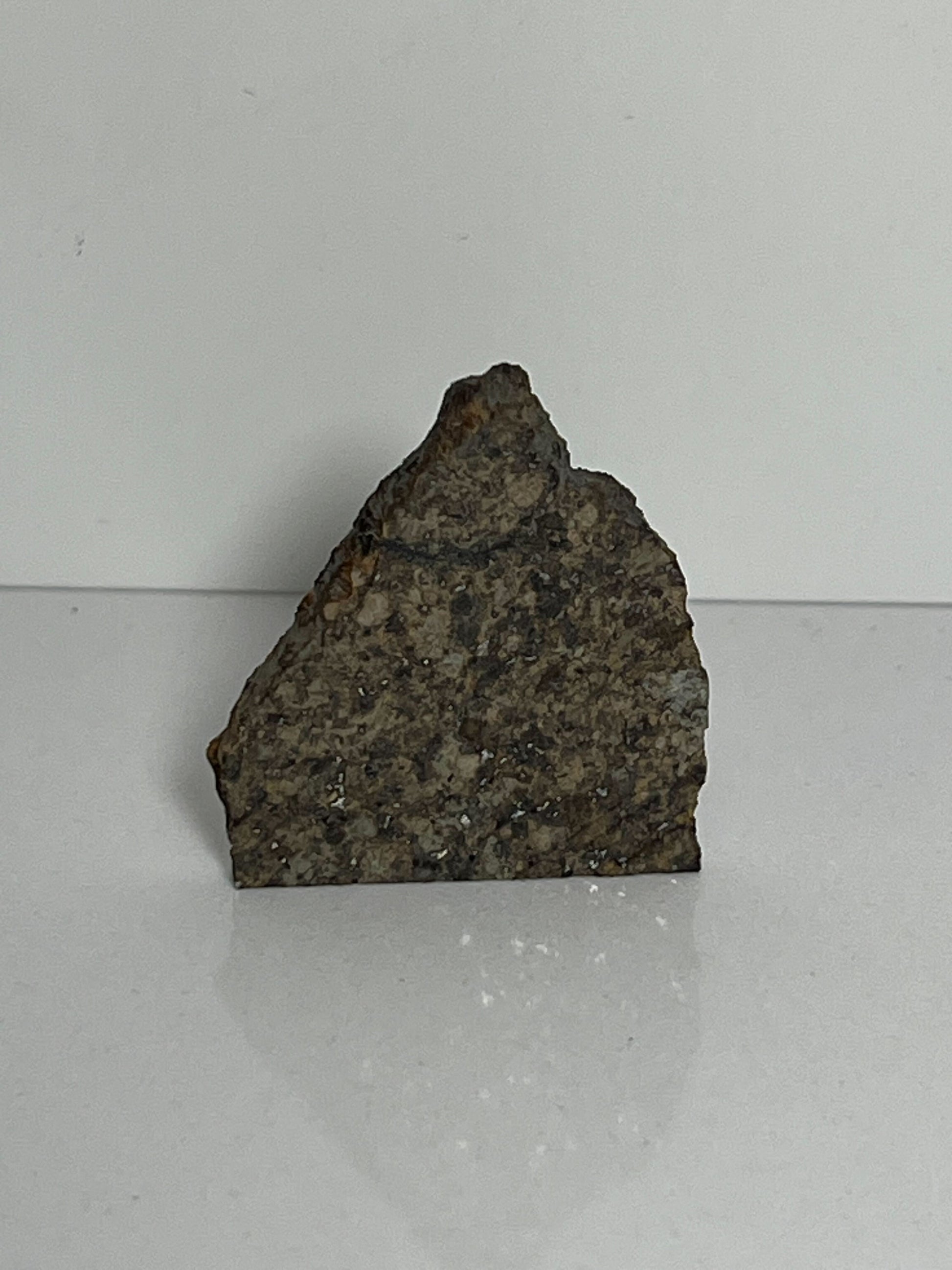 Slice from "Tazizilet" meteorite recovered in Niger, Africa at 17°38.628’N, 9°26.485’E in 2006. This rare, low iron stone meteorite was recovered in 2006 in Agadez, Niger; only one of three meteorites ever recovered in that country. Only one specimen with a total gram weight of less than 1 kilogram was recovered.