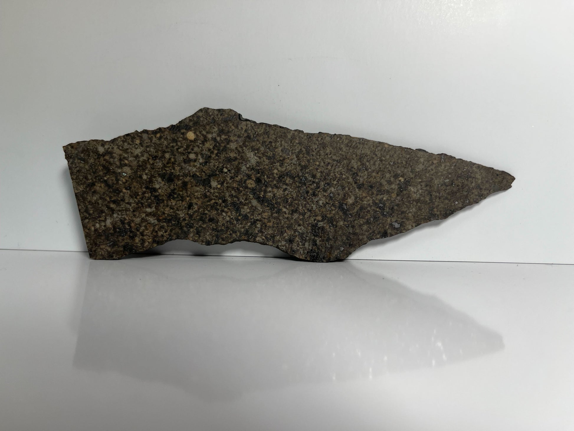 Tazizilet Meteorite Physical Characteristics: Complete individual, some weathered fusion crust, axe-head shaped stone. Saw cut reveals numerous chondrules in a brown-green, medium-grained groundmass, metal/sulfide scattered throughout, also some metal veinlets.