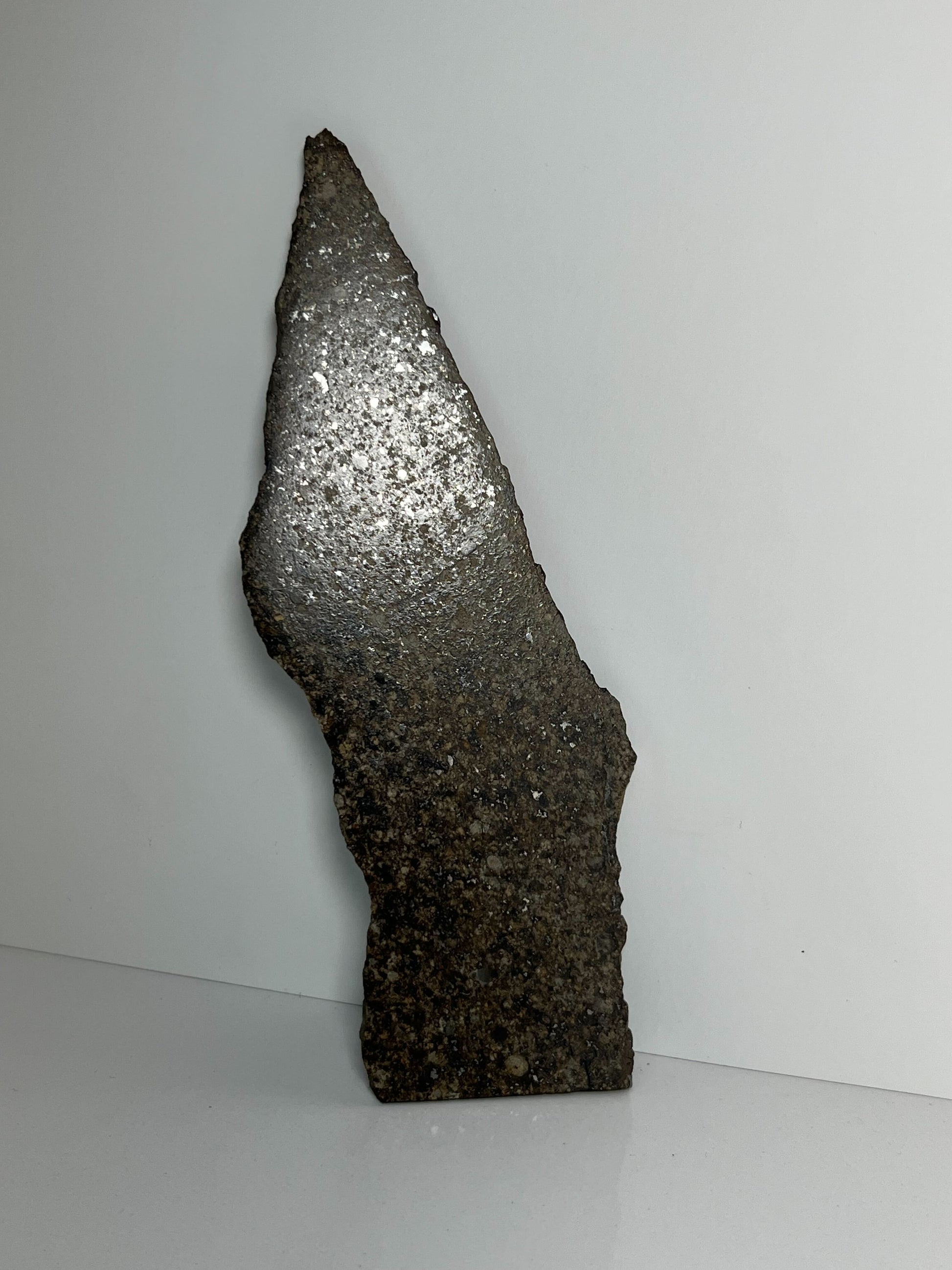 Slice from "Tazizilet" meteorite recovered in Niger, Africa at 17°38.628’N, 9°26.485’E in 2006. This rare, low iron stone meteorite was recovered in 2006 in Agadez, Niger; only one of three meteorites ever recovered in that country. Only one specimen with a total gram weight of less than 1 kilogram was recovered.