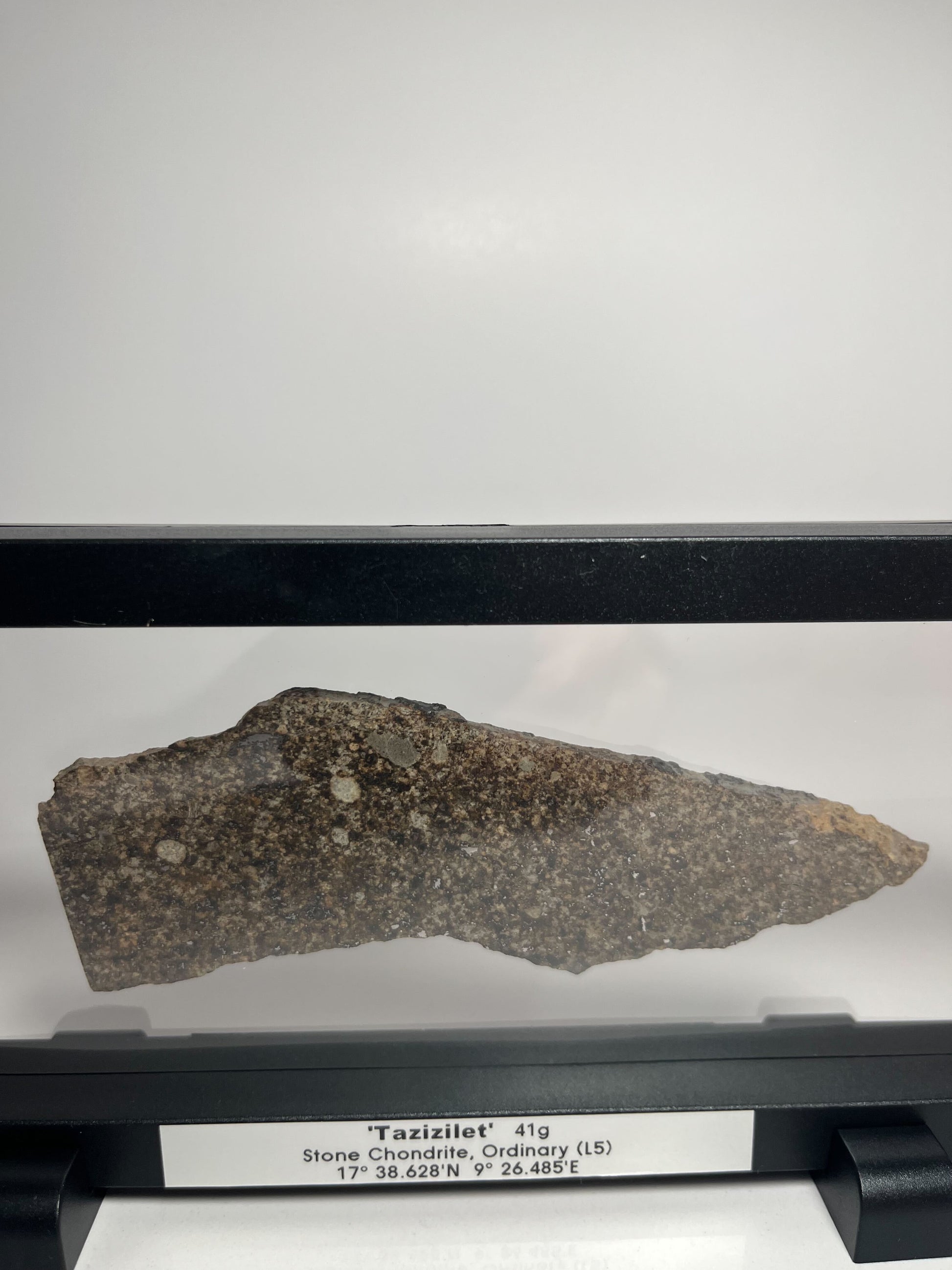 Slice from "Tazizilet" meteorite recovered in Niger, Africa at 17°38.628’N, 9°26.485’E in 2006. This rare, low iron stone meteorite was recovered in 2006 in Agadez, Niger; only one of three meteorites ever recovered in that country. Only one specimen with a total gram weight of less than 1 kilogram was recovered.